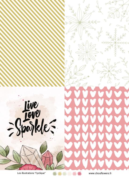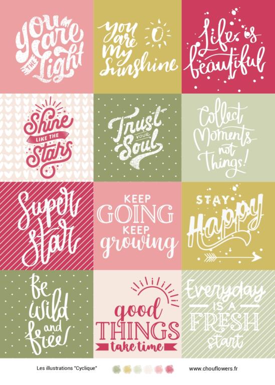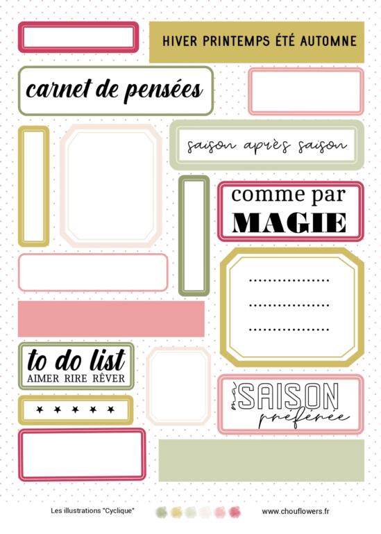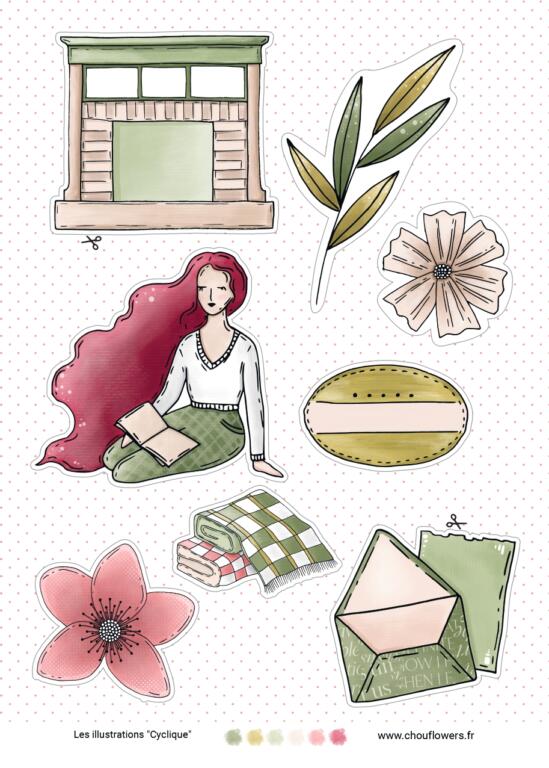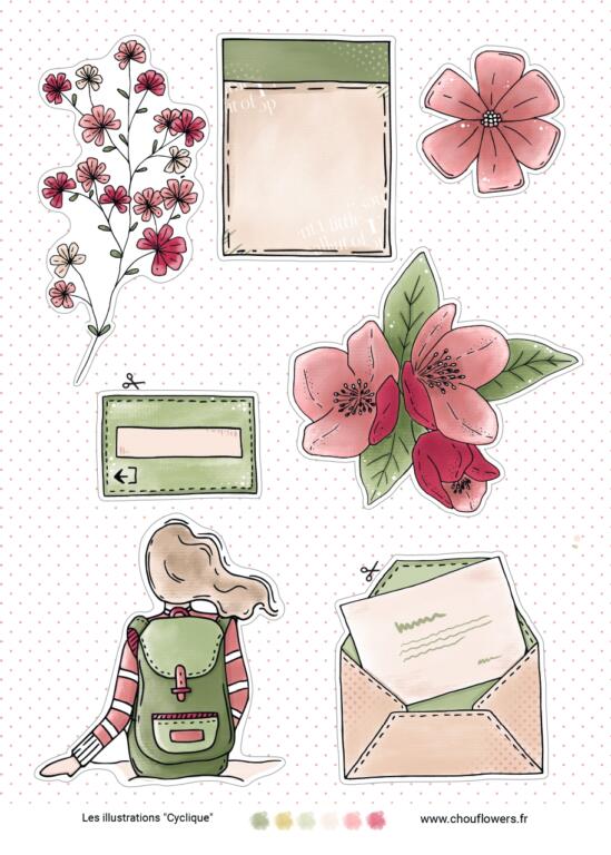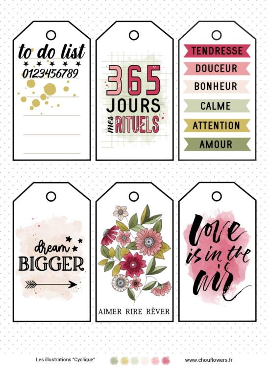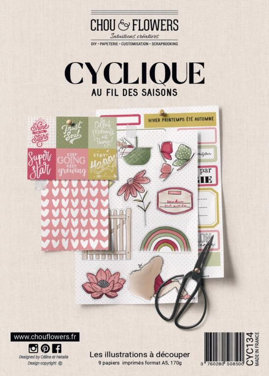 9 Papiers Imprimés d'illustrations, Etiquettes, Fleurs, Tags, à découper coordonnée aux papiers de la collection Cyclique