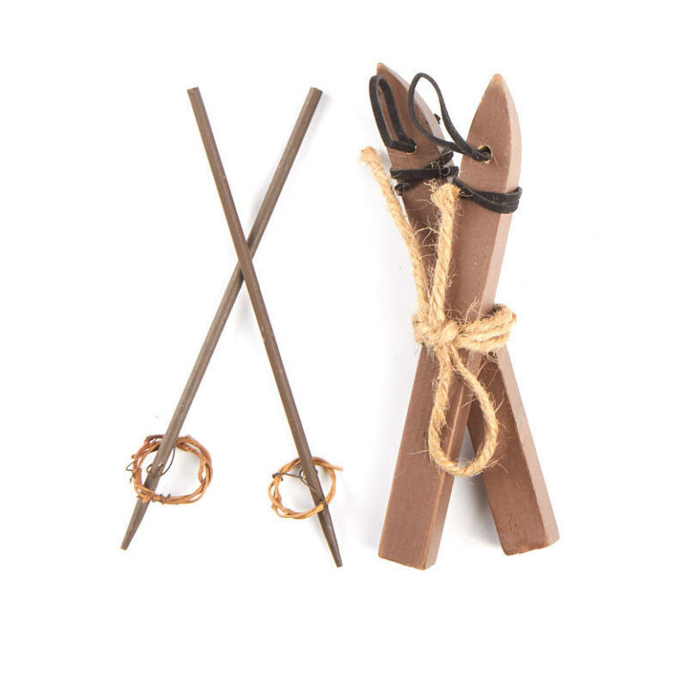 Petite Paire de ski en relief en bois, Style vintage, avec bâtons de ski.