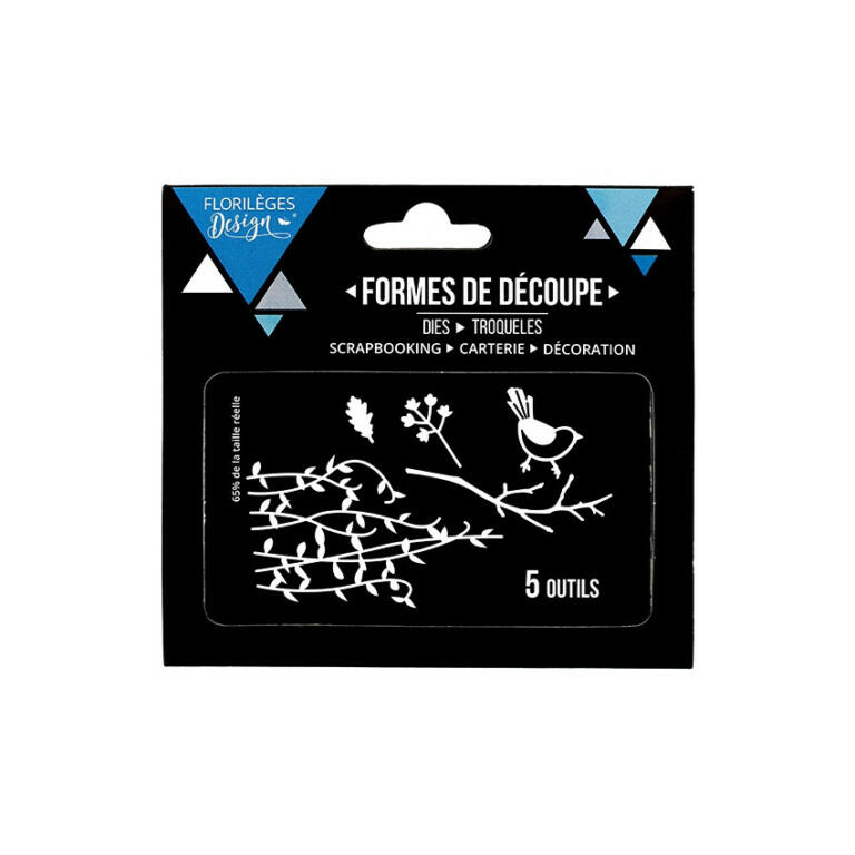 5 Découpes : Quelques Dimensions3.7X2.9cm pour l'Oiseau, 8.4X2.6cm pour la Branche, 2.1x1cm pour la Feuille, 10.4x6cm pour le Branchage, et 3.4x2cm environ pour la Petite Tige