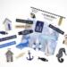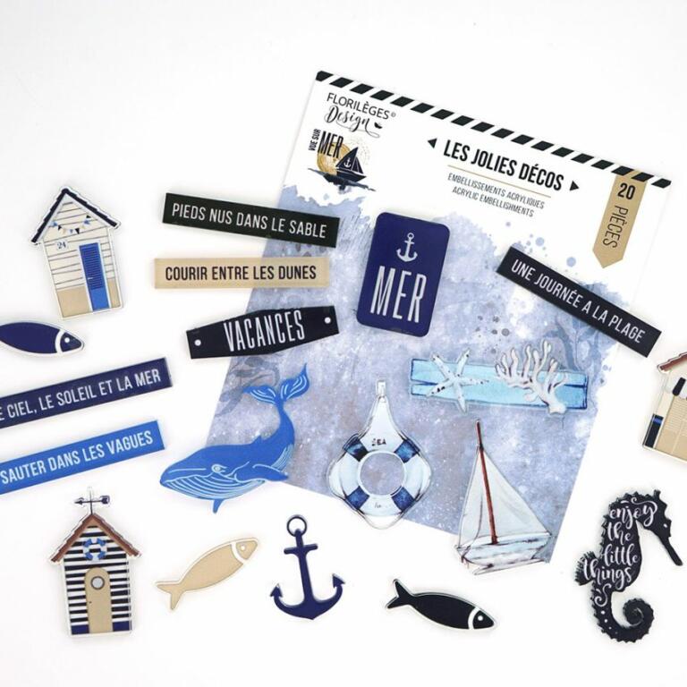 Assortiment de petites décos en acryliques , aux motifs variés sur le thème de la mer et des vacances assorties aux papiers de la Collection VUE SUR MER de Florilèges Design
