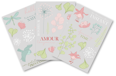 Assortiment de 3 planches de décalcomanies, Fleurs et Textes en Français, en Couleur et en Blanc.