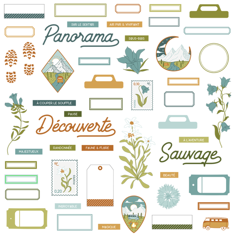 Assortiment de Die cuts Motifs, et Mots coordonnées aux papiers de la collection