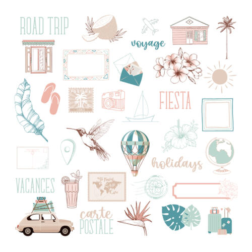 Une collection aux couleurs pastels sur le thème des vacances et du soleil.