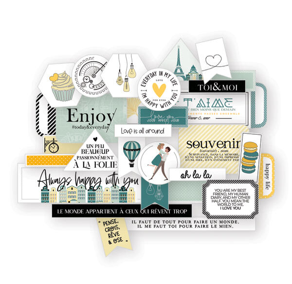 Assortiment de Petites vignettes, avec des Expressions en Français et en Anglais, des petits dessins assortis aux papiers de la collection.