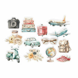 Assortiment de Die Cut : 13 Motifs sur le thème du voyage, Valises, Avions, Vespa..... Assorties à la collection Travel Journal