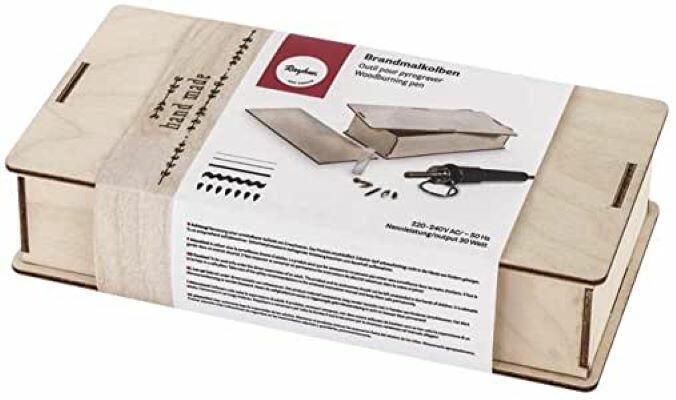 Le kit Contient: l'Outils à pyrograver, avec poignée ergonomique souple, 5 pointes différentes, support de rangement, Bois d'essai et Instructions.